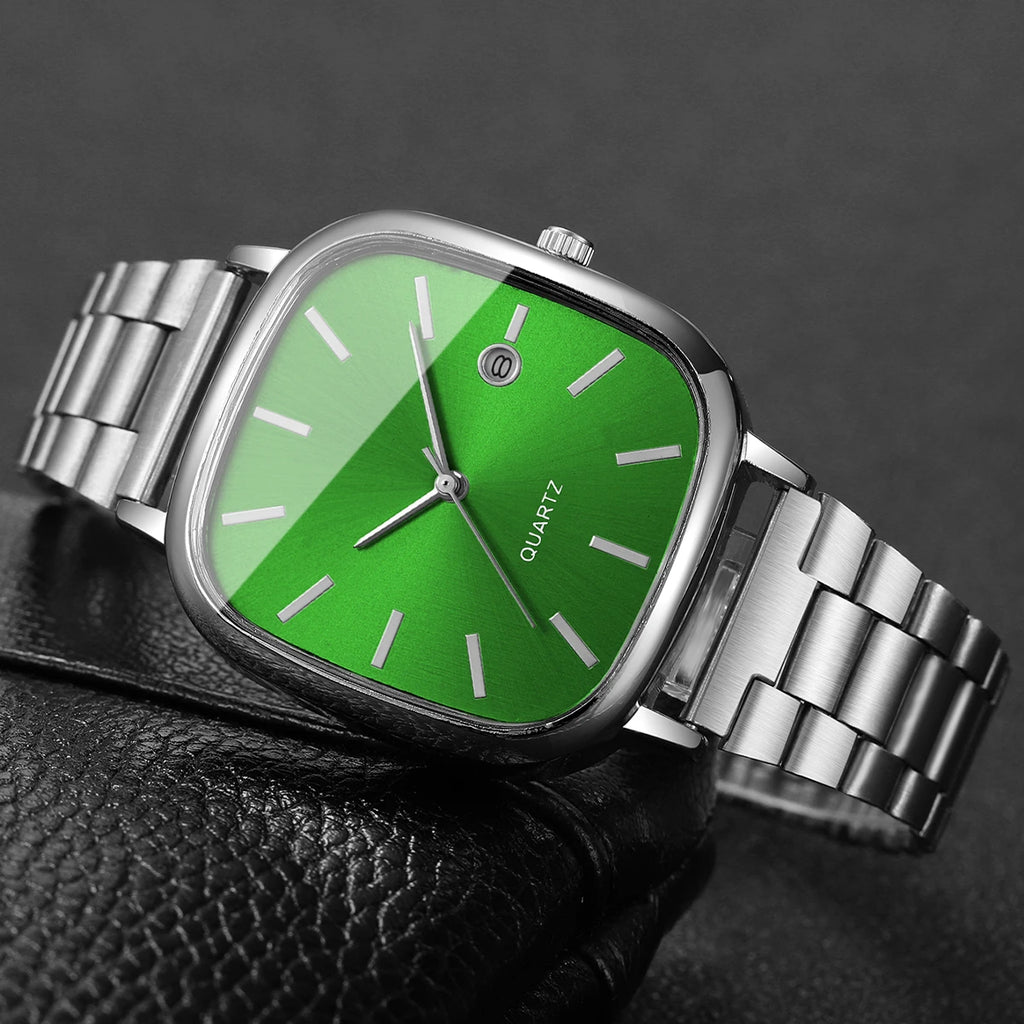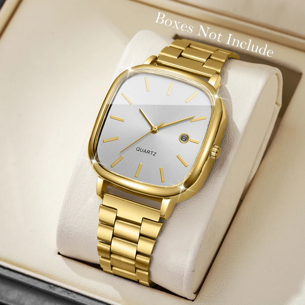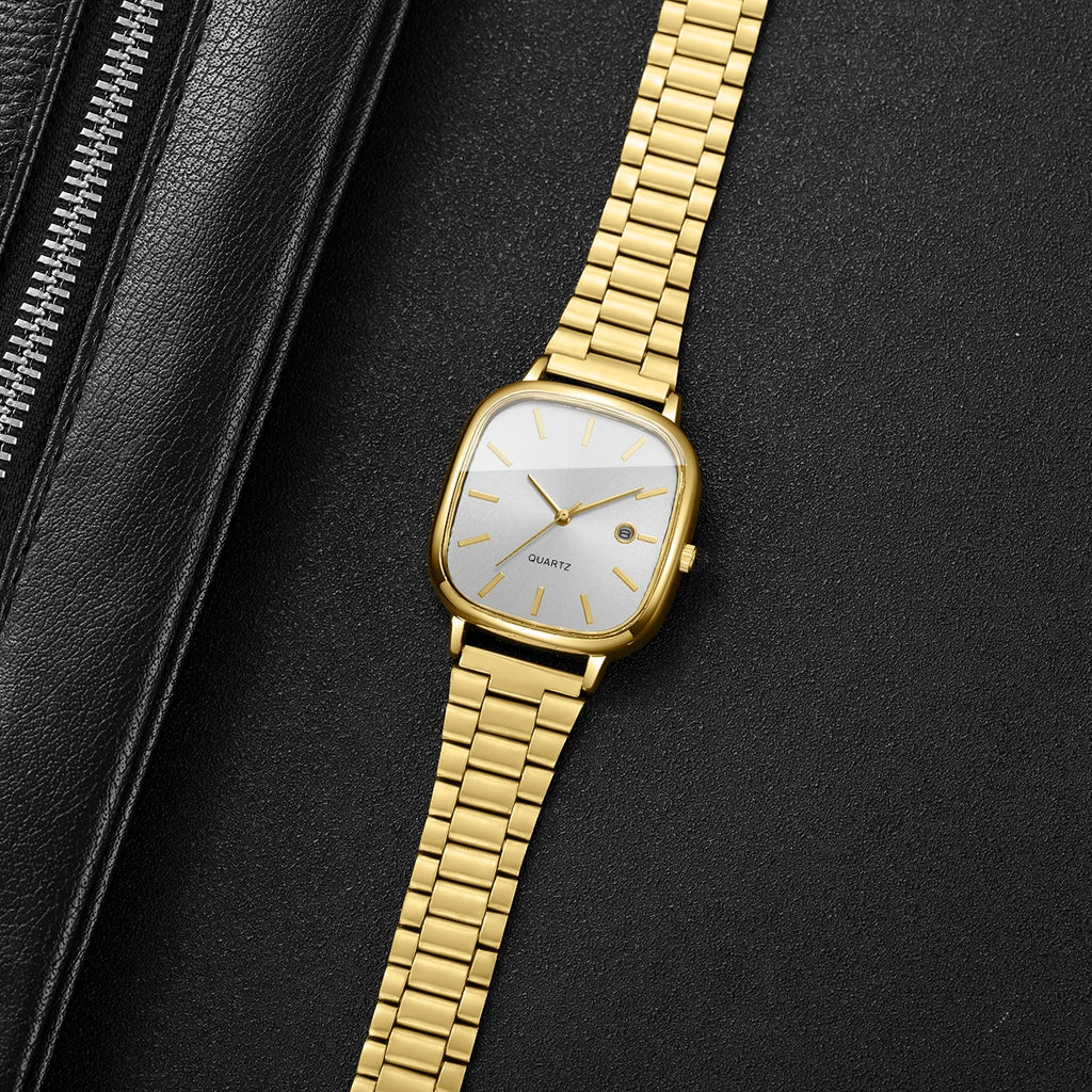 Relógio masculino com design quadrado elegante e moderno, perfeito para o dia a dia e ocasiões de negócios. Movimento de quartzo preciso com calendário integrado. Pulseira em liga metálica com fecho tipo gancho, confortável e durável. Mostrador sem números para um visual minimalista e sofisticado. Bateria incluída e pronto para usar. Ideal para quem busca um acessório versátil que combina estilo casual com funcionalidade. Apresentação sem caixa.