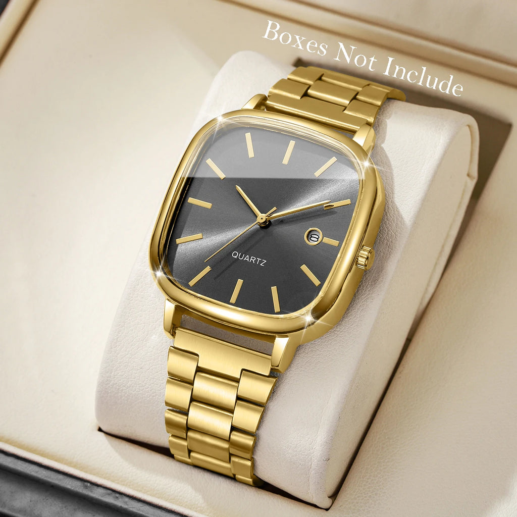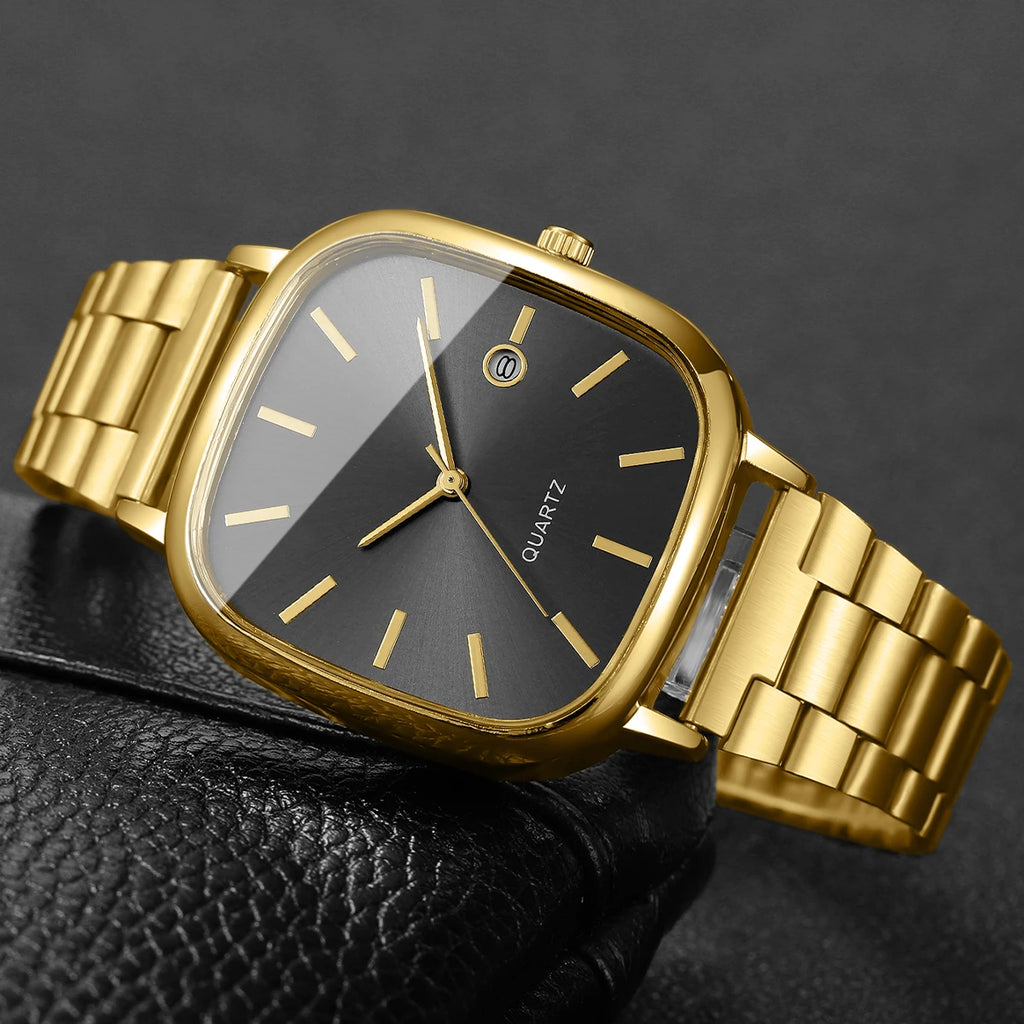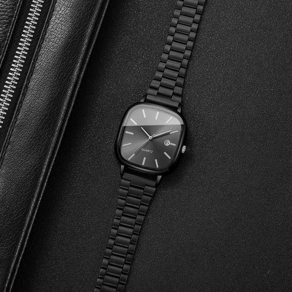 Relógio masculino com design quadrado elegante e moderno, perfeito para o dia a dia e ocasiões de negócios. Movimento de quartzo preciso com calendário integrado. Pulseira em liga metálica com fecho tipo gancho, confortável e durável. Mostrador sem números para um visual minimalista e sofisticado. Bateria incluída e pronto para usar. Ideal para quem busca um acessório versátil que combina estilo casual com funcionalidade. Apresentação sem caixa.